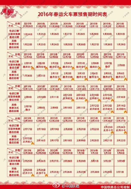 [詳細(xì)描述]求2016年春運(yùn)火車票預(yù)售期時(shí)間表日歷?謝謝