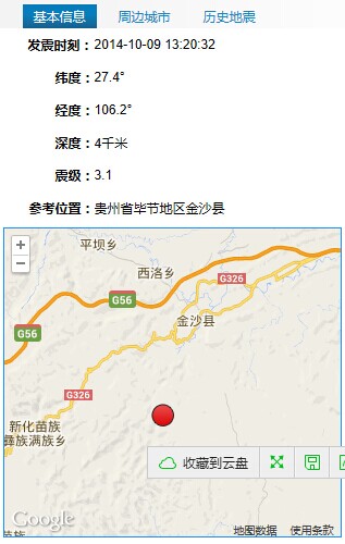 據中國地震臺網正式測定:2014年10月9日13時20分在貴州省畢節(jié)地區(qū)金沙縣(北緯27.4度,東經106.2度)發(fā)生3.1級地震,震源深度4千米。