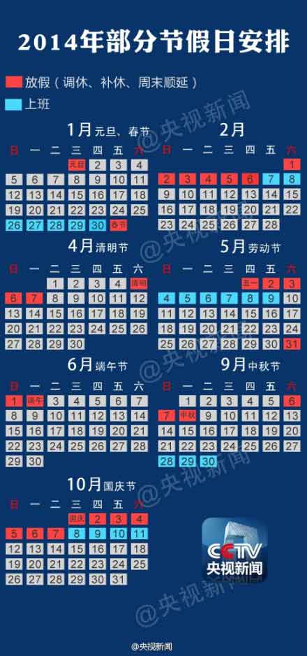 各省、自治區(qū)、直轄市人民政府,國(guó)務(wù)院各部委、各直屬機(jī)構(gòu): 經(jīng)國(guó)務(wù)院批準(zhǔn),現(xiàn)將2014年元旦、春節(jié)、清明節(jié)、勞動(dòng)節(jié)、端午節(jié)、中秋節(jié)和國(guó)慶節(jié)放假調(diào)休日期的具體安排通知如下。 一、元旦:1月1日放假1天。 二、春節(jié):1月31日至2月6日放假調(diào)休,共7天。1月26日(星期日)、2月8日(星期六)上班。 三、清明節(jié):4月5日放假,4月7日(星期一)補(bǔ)休。 四、勞動(dòng)節(jié):5月1日至3日放假調(diào)休,共3天。5月4日(星期日)上班。 五、端午節(jié):6月2日放假,與周末連休。 六、中秋節(jié):9月8日放假,與周末連休。 七、國(guó)慶節(jié):10月1日至7日放假調(diào)休,共7天。9月28日(星期日)、10月11日(星期六)上班。 節(jié)假日期間,各地區(qū)、各部門要妥善安排好值班和安全、保衛(wèi)等工作,遇有重大突發(fā)事件,要按規(guī)定及時(shí)報(bào)告并妥善處置,確保人民群眾祥和平安度過(guò)節(jié)日假期。 國(guó)務(wù)院辦公廳 2013年12月11日 |