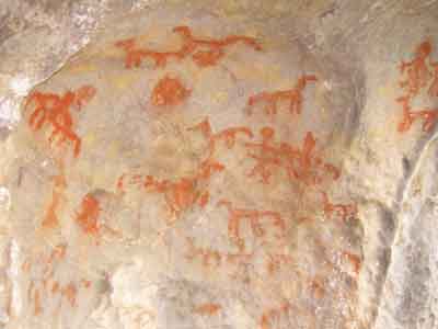 付家院巖畫群遺址位于貴州省長順縣威遠(yuǎn)鎮(zhèn)付家院村龍家院,距縣城12千米。這個巖畫群分兩壁,一壁繪在當(dāng)?shù)厝私凶黾t洞的巖壁上,另一壁繪在名叫白洞的巖壁上,兩處巖壁皆在同一座山上,相距約100米。白洞巖壁較裸露,早年農(nóng)民在此開了一眼窯洞燒制石灰,煙熏和灰塵污染嚴(yán)重,加之長期的風(fēng)雨剝蝕,致使白洞的巖畫大部分遭到破壞,甚為可惜。現(xiàn)在只剩下一些殘圖依稀可辨,但若經(jīng)過專門的技術(shù)處理,將塵封的地方清理出來,該處的大部分圖案也許還可復(fù)原。紅洞巖洞蓋面長約20米,寬約7米,畫面處離地約2.3米。巖畫所用的顏色系鐵紅色粉之類的礦物,呈紅褐色。尚能清晰辨認(rèn)圖案有一百多個,主要是人、馬、狗、飛禽、田疇等。此外還有一些特殊的符號。圖案個體不大,小的只有幾厘米,最大的一幅有45厘米長、29厘米寬,呈不規(guī)則三角形。從該圖側(cè)身望去、但見一塊田疇幾乎同該圖完全對應(yīng),由此推知這當(dāng)是一幅田疇圖象。 巖畫群中,有一幅狩獵圖十分引人注目,畫面上繪有一個騎馬引弓搭箭作欲射狀的獵手,左右前上方皆有一人騎馬奔馳,這幾人的馬前馬后是狗群,人、馬、狗形成包圍圈,圈內(nèi)有野獸蹄痕的符號標(biāo)記,整個畫面呈出一派緊張的獰獵場面。值得注意的是巖畫中多處有這樣的符號:“+”,考古專家兼作家何新在《諸神的起源》一書中曾考證過這種符號(大量出在中國古代典籍、陶器、石刻、銅器等文物中),認(rèn)為同遠(yuǎn)古華夏民族對太陽神的崇拜有關(guān),并認(rèn)定就是太陽神的符號。從總體上看,付家院巖畫群描繪的是一幅獰獵和農(nóng)耕生活并存的場景。據(jù)附近上了年紀(jì)的老人們講,他們在孩兒時代就已經(jīng)見過這些巖畫,當(dāng)?shù)貍髡f這些畫是仙人所作,這個傳說或許能夠說明這些巖畫產(chǎn)生年代的久遠(yuǎn)。 從美學(xué)角度來看,這些圖案的造型都極簡約概括,這種天真、稚拙、純樸的表現(xiàn)手法正是藝術(shù)的一般風(fēng)格。有趣的是這些巖畫同云南滄源的原始巖畫(據(jù)考證為新石器時代的產(chǎn)物)、廣西寧明花山巖畫、四川麻塘獅子巖畫頗有近似之處。這種現(xiàn)象不能不使人聯(lián)想到這些不同地區(qū)的巖畫作者是否有某種族源的或文化的聯(lián)系。如果將巖畫這種文化現(xiàn)象作為一種文本看待,那么對這一文本的釋讀將成為研究貴州民族學(xué)的一種有力的實證資料。 相關(guān)附件: ![]() |